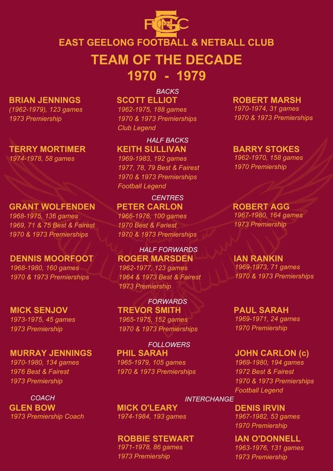 Congratulations to all those selected in the East Geelong Football and Netball Club Team of the 1970's. In the lead up to our 150th year in 2029, the Club will be announcing a team of each decade, culminating with a team of the last 60 years in the 2029 celebrations. We can't wait until the Team of the 80's in 2024.