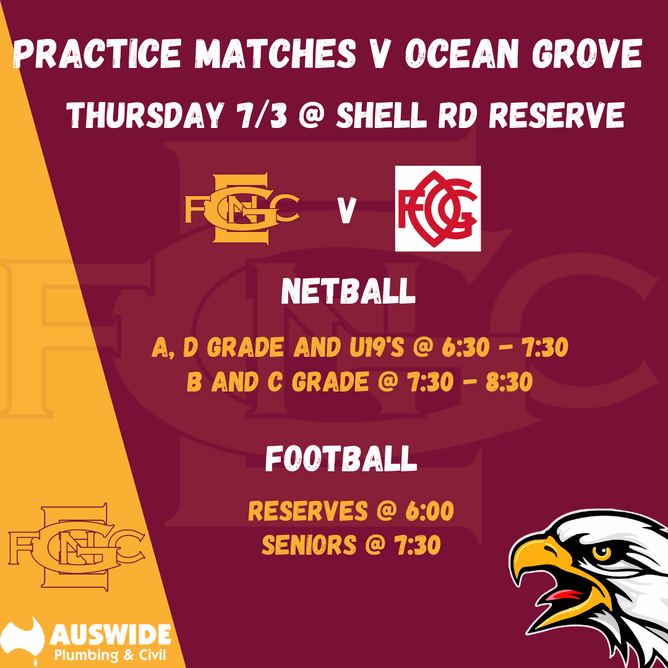 Get along to Shell Reserve in Ocean Grove for a full board of practice matches for Football and Netball. Footy kicks off at 6pm and Netball at 6:30