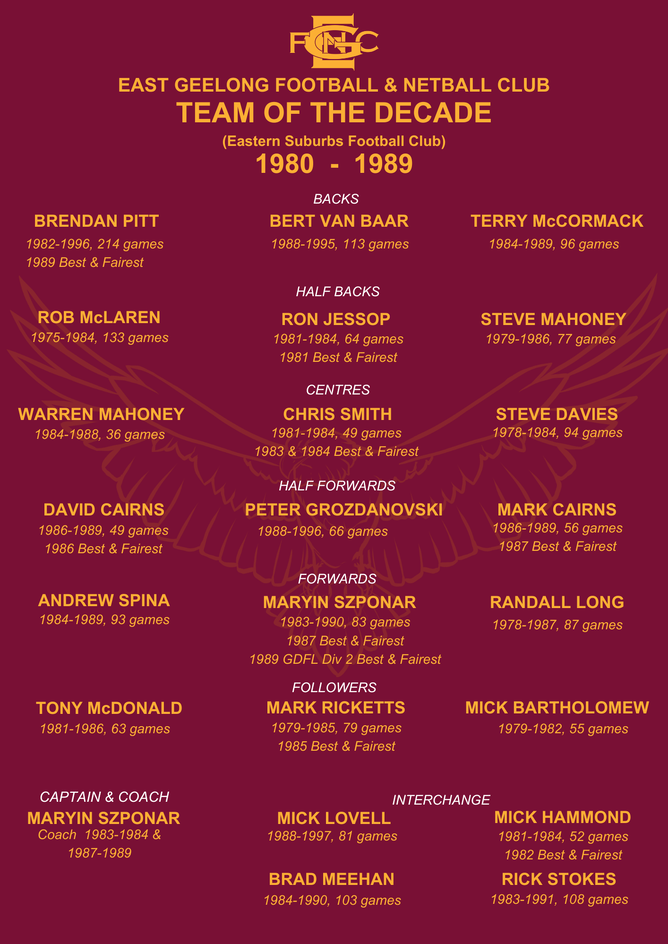 Congratulations to all members of the Team of the 80's announced at Past Players Day on 27 April at the North Geelong match. It was a great day with many of the team present. We look forward to the announcement of the Team of the 90's in 2025!