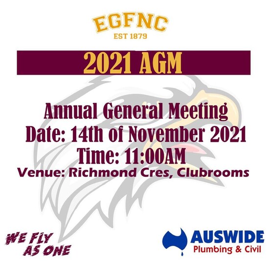 The Annual General Meeting of the East Geelong Football and Netball Club will be held at the Richmond Oval Clubrooms at 11am on Sunday 14th November. All members welcome.